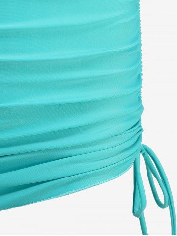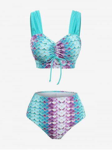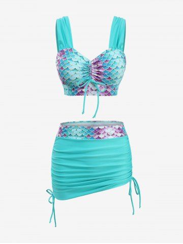 Mermaid Scale Print Cinched Three Piece Tankini Swimsuit - Turquoise - S