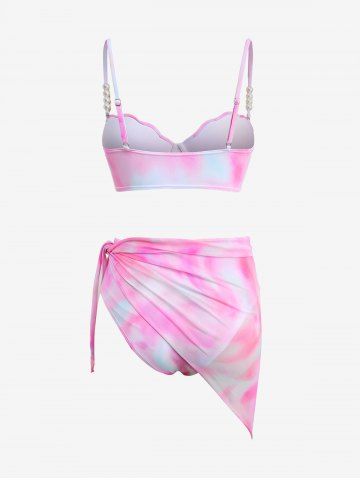 Ombre Tie Dye Print Shell Cup Chains Strap Tankini Top And Tie Asymmetrical Skirted 3 Piece Tankini Swimsuit - Light Pink - L