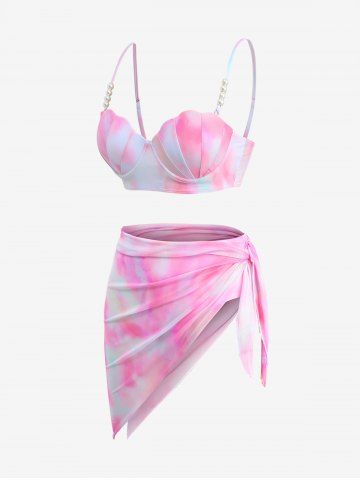 Ombre Tie Dye Print Shell Cup Chains Strap Tankini Top And Tie Asymmetrical Skirted 3 Piece Tankini Swimsuit - Light Pink - Xxl
