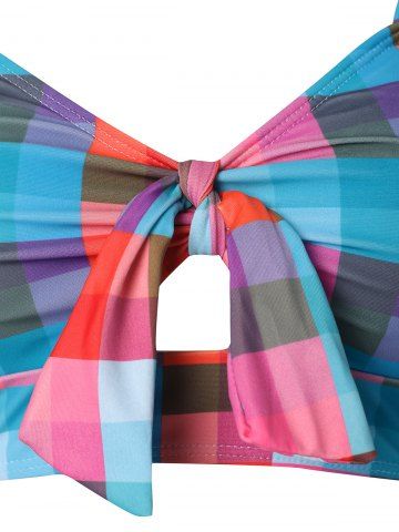 Plaid Padded Bowknot Tankini Swimwear - Light Blue - Xxl