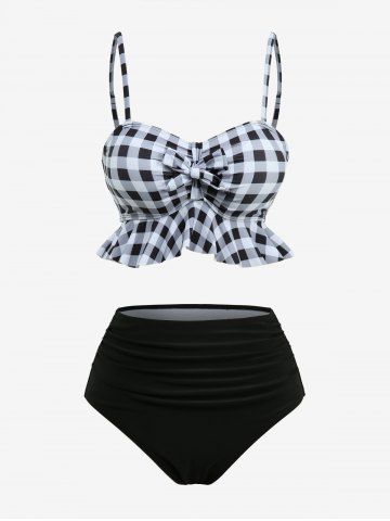 Plaid Print Bowknot Peplum Hem Ruched Tankini Swimsuit (Adjustable Shoulder Strap) - Black - Xxxl