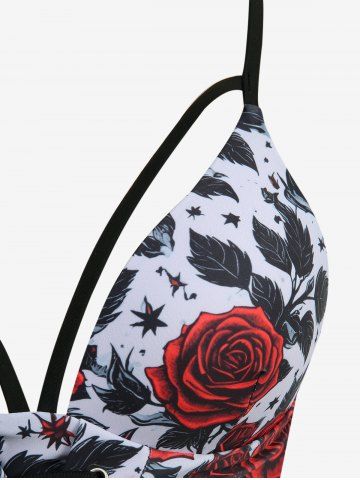 Rose Flower Leaf Print Lace Up Strappy Tankini Swimsuit (Adjustable Shoulder Strap) - Red - Xxxl