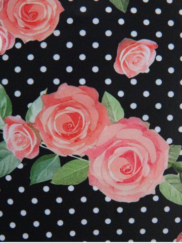 Rose Flowers Dots Print Bowknot Buttons Halter Tankini Swimsuit - Black - Xl