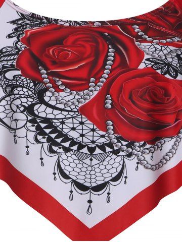 Ruffle Rose Print Tankini Swimsuit - Deep Red - L