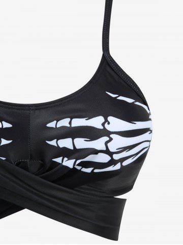 Skull Bone Skeleton Print Crossover Tankini Swimsuit (Adjustable Shoulder Strap) - Black - L