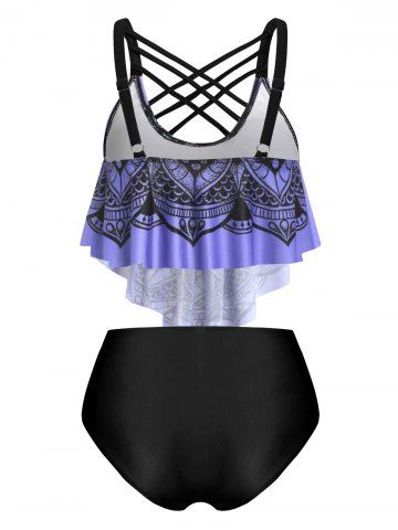 Skull Flower Print Criss-cross Padded Tankini Set - Purple - M
