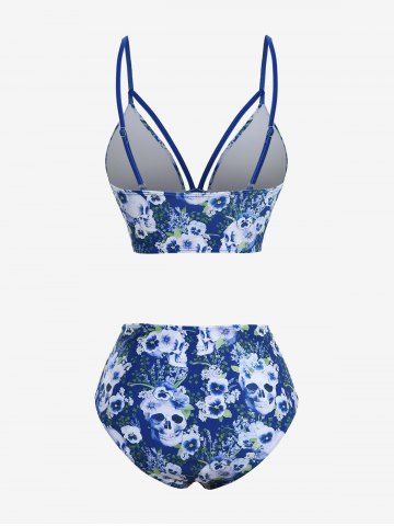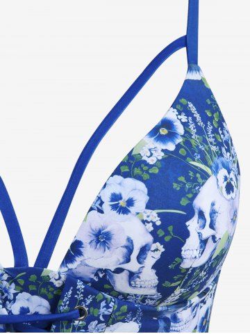 Skull Hibiscus Flower Leaf Print Lace Up Strappy Ruched Tankini Swimsuit (Adjustable Shoulder Strap) - Navy Blue - Xl