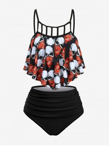 Skull Paisley Mask Print Hollow Out Peplum Hem Tankini Swimsuit (Adjustable Shoulder Strap) - Red - L