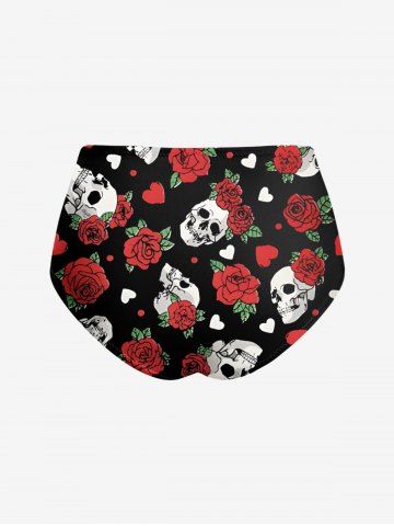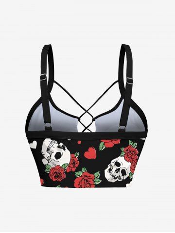 Skull Rose Flower Leaf Heart Print Hawaii Tankini Swimsuit Plus Size Matching Set - Black