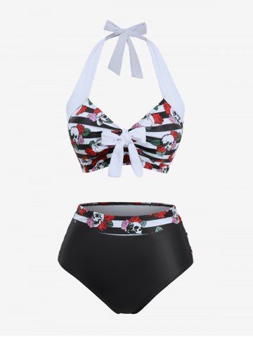 Skull Rose Flower Striped Print Bowknot Halter Lace Up Braided Tankini Swimsuit - Black - S
