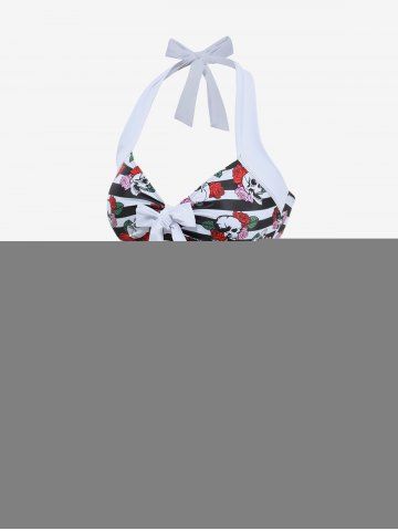 Tankinis > Skull Rose Flower Striped Print Bowknot Halter Lace Up Braided Tankini Swimsuit