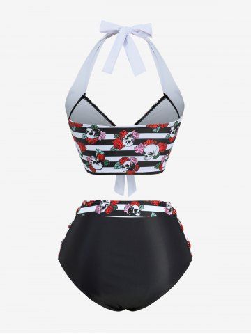 Skull Rose Flower Striped Print Bowknot Halter Lace Up Braided Tankini Swimsuit - Black - Xxl