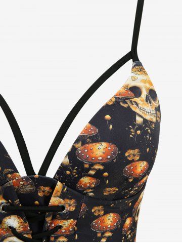 Skulls Mushroom Print Lace Up Panel Ruched Tankini Swimsuit - Black - Xxl