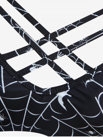 Spider Web Bat Print Lattice Crisscross Lace Up Tankini Swimsuit - Black - M