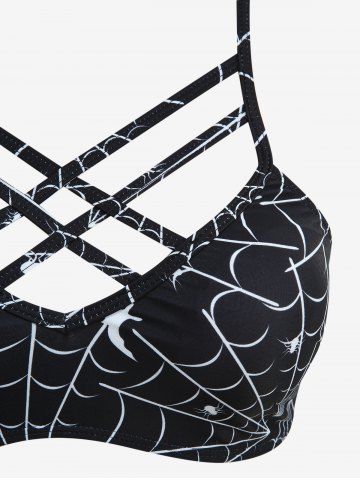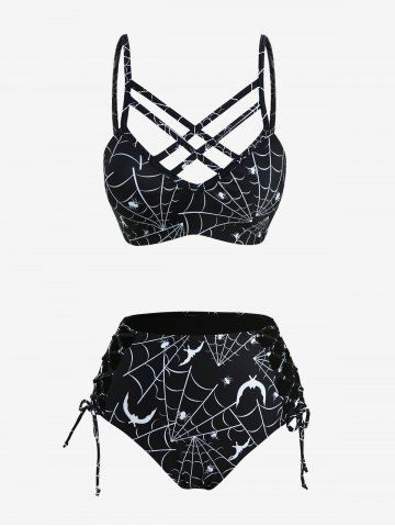 Spider Web Bat Print Lattice Crisscross Lace Up Tankini Swimsuit - Black - Xxxl