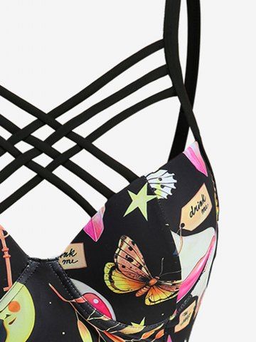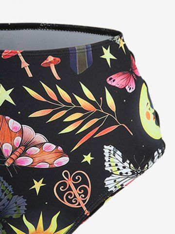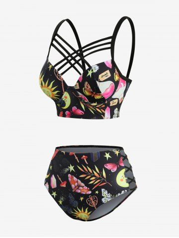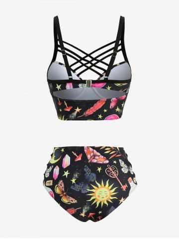 Sun Moon Star Leaf Branch Butterfly Mushroom Print Cut Out Back Crisscross Tankini Swimsuit - Black - M