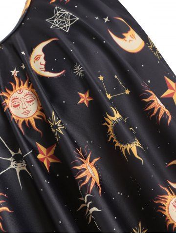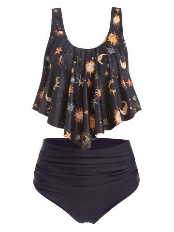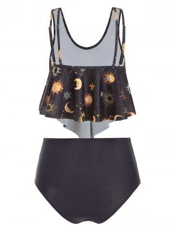 Sun Stars Moon Flounce High Waisted Tankini Swimsuit - Black - 3xl