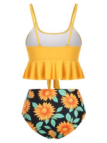 Sunflower Knot Ruffled Ruched Tankini Swimwear - Yellow - S