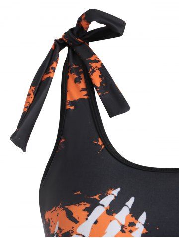 Tie Dye Skeleton Hand Lace Insert Bowknot Tankini Swimwear - Black - Xl