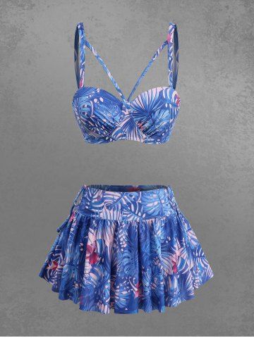 Tankinis > Tropical Leaf Flowers Print Cinched Pleated Skirt Tankini Swimsuit