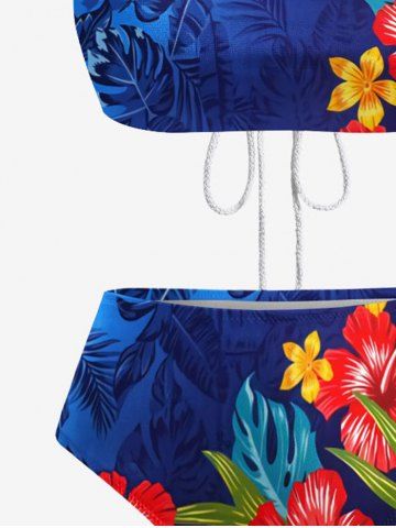 Tropical Leaves Floral Print Hawaii Ombre Hollow Out Backless Tankini Swimsuit - Sky Blue - M