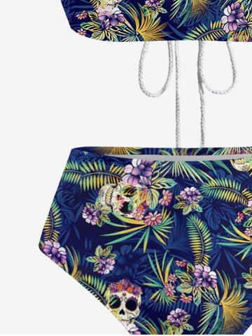 Tropical Leaves Floral Skulls Print Hawaii Hollow Out Backless Tankini Swimsuit - Blue - Xl