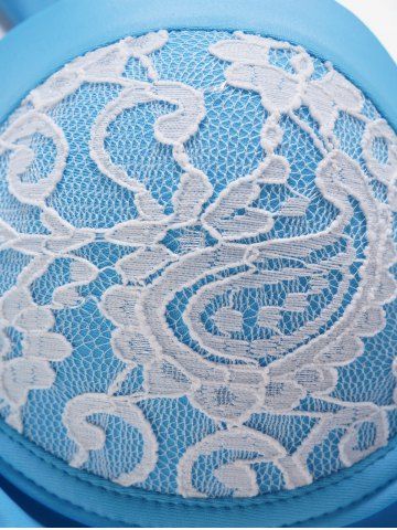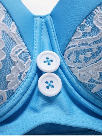 Tummy Control Flower Lace Panel Underwire Mock Button Halter Tankini Swimsuit - Light Blue - M