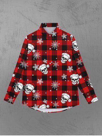 Gothic Christmas Hat Skull Snowflake Plaid Print Buttons Turn-down Collar Long Sleeves Shirt For Men - Red - 3xl
