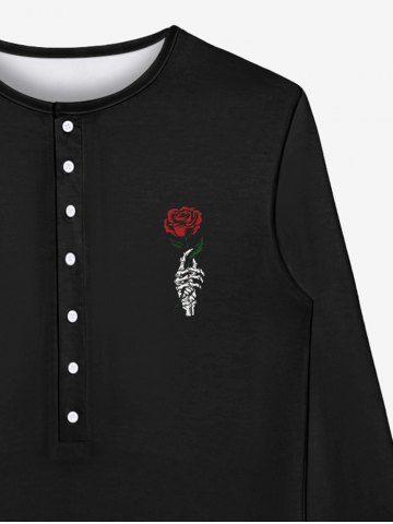 Gothic Halloween Skeleton Claw Rose Print Buttons T-shirt For Men - Black - S