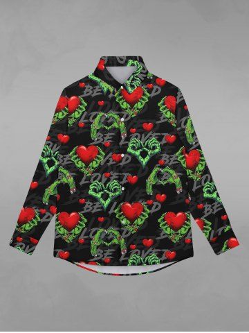 Gothic Valentine's Day Heart Skeleton Claw Print Button Down Shirt For Men - Deep Green - 6xl