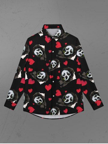 Gothic Valentine's Day Skulls Ghost Heart Print Button Down Shirt For Men - Black - 3xl