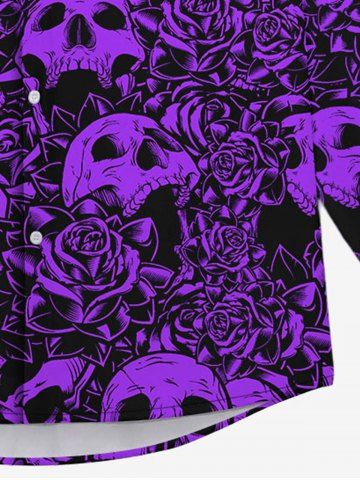Gothic Valentine's Day Skulls Rose Flowers Print Button Down Shirt For Men - Purple - 7xl