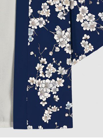 Men's Flower Crane Sun Print Open Front Kimono Top - Deep Blue - 4xl