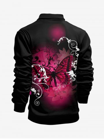 Plus Size Butterfly Flower Print Zipper Polo Shirt For Men - Black - L