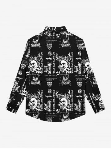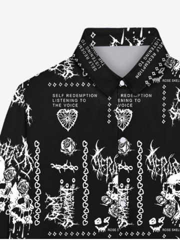 Gothic Heart Skulls Flowers Print Halloween Buttons Shirt For Men - Black - 3xl