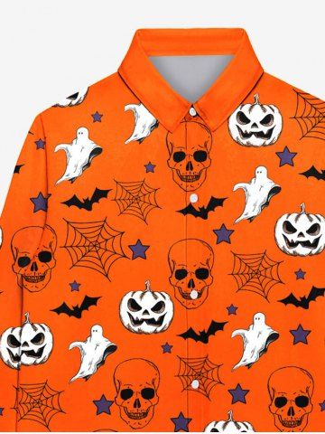 Gothic Pumpkin Skull Ghost Bat Spider Web Star Print Halloween Buttons Shirt For Men - Orange - Xl