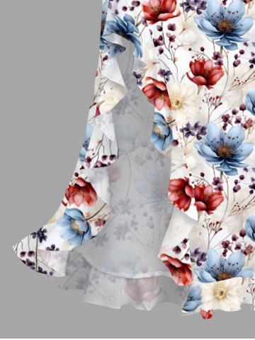Flower Branch Print Hawaii Ruffles Split Dress - White - L