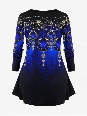Plus Size Christmas Ball Tassel Floral Print Long Sleeves T-shirt - Navy Blue - L