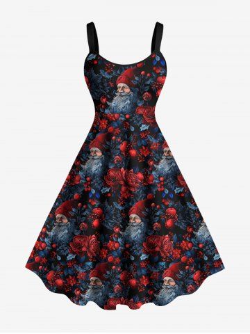 Plus Size Christmas Santa Claus Flowers Leaf Fruit Print Tank Dress - Black - 3x