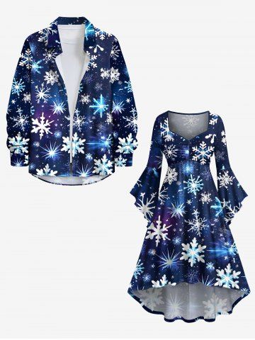 TRENDING NOW > Plus Size Christmas Snowflake Galaxy Print Ruched Flare Sleeves High Low Dress