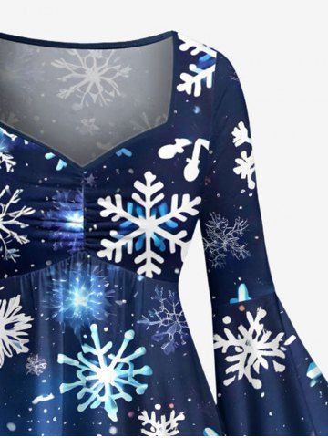 Plus Size Christmas Snowflake Galaxy Print Ruched Flare Sleeves High Low Dress - Navy Blue - L