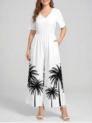 Plus Size Coconut Tree Print V Neck Hawaii Wide Leg Jumpsuit - White - S