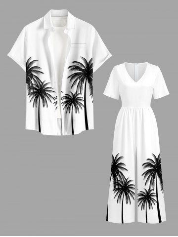 Plus Size Coconut Tree Print V Neck Hawaii Wide Leg Jumpsuit - White - L