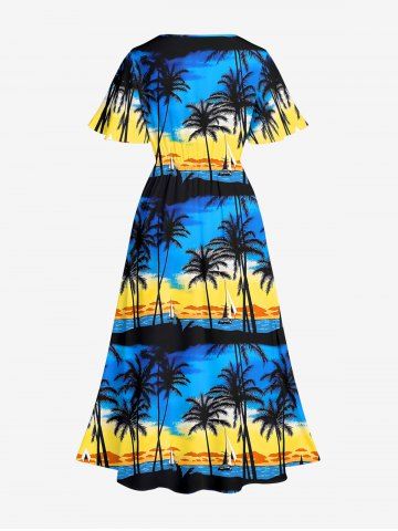 Plus Size Coconut Tree Sailboat Seascape Print Split Hawaii Midi Dress - Deep Blue - Xxs