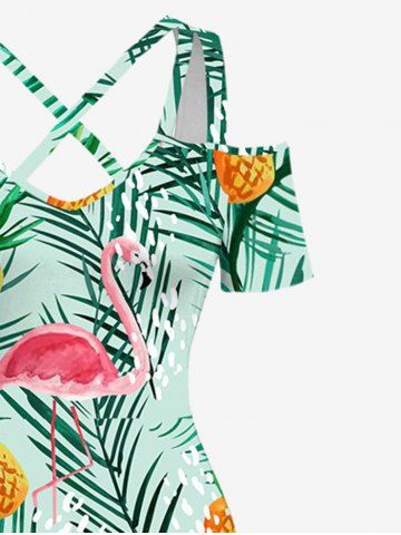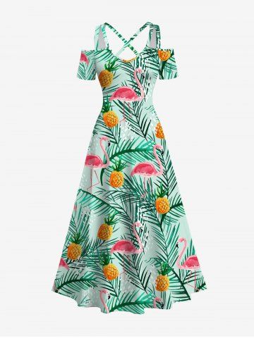Plus Size Flamingo Coconut Tree Pineapple Print Crisscross Cold Shoulder Hawaii Dress - Green - Xs