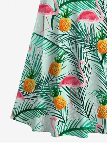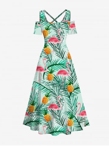 Plus Size Flamingo Coconut Tree Pineapple Print Crisscross Cold Shoulder Hawaii Dress - Green - 3x