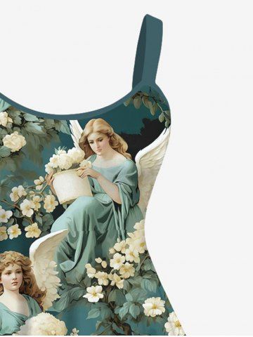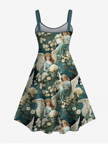 Renaissance Plus Size Angel Flower Wings Print Backless A Line Tank Dress - Green - 5x