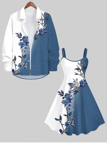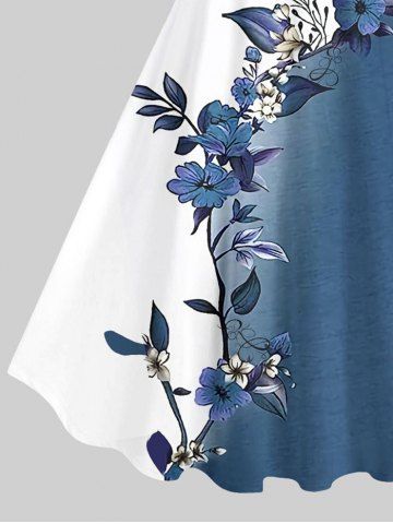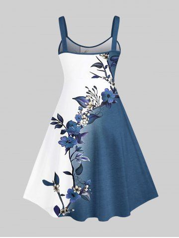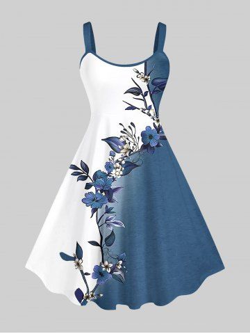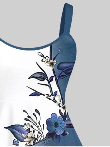 Plus Size Flowers Leaf Contrast Colorblock Print Hawaii Tank Dress - Blue - 6x