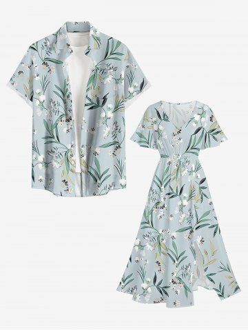 Plus Size Flowers Leaf Print Split Hawaii Midi Dress - Blue Gray - S
