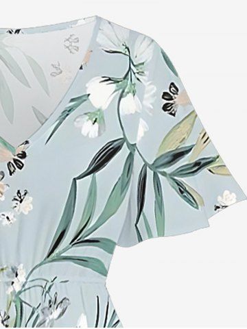 Plus Size Flowers Leaf Print Split Hawaii Midi Dress - Blue Gray - 2x